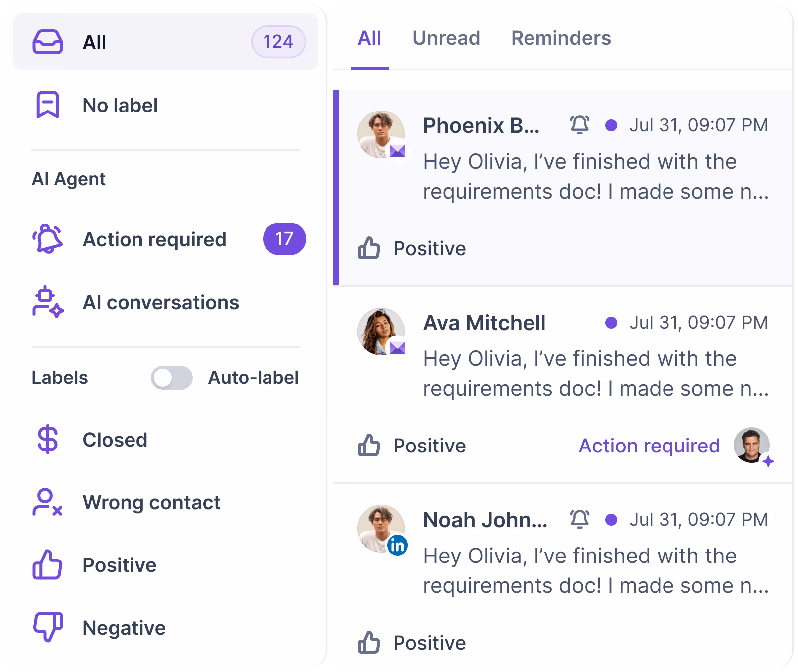 Primebox™ keeps you in control by consolidating all your replies across email and LinkedIn in one place, capturing replies from any address (even if the prospect responds from a different email) and layering in AI analysis and smart tools to help you respond faster, better, and always on time - so you never lose a prospect in the noise. Included for free with every Salesforge subscription.